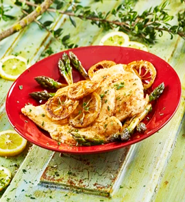 Harmonização | Perfeito para carnes vermelhas em geral, carnes brancas e queijo de cabra, Gouda e Emmental. Um prato de frango é sempre uma excelente opção! Experimente esta receita de frango com limão e espargos |